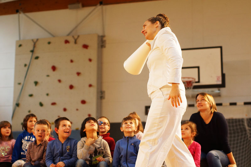 Ihre Hände angeln spontan nach einem Schal. Und auch ein Schuh oder ein Haarreif wechseln so im Publikum den Besitzer. Es ist ein spielerischer Versuch, zeitlich begrenzt Anordnungen zu verändern und zu schauen, was passiert. Was soll ein Kind mit einem Erwachsenenschuh? Ist das ein guter Deal? Die beiden wahren zugleich die Ordnung. Es ist ein Stück für die Kinder. Alle – selbst die erwachsenen Begleiter – bekommen ihre Sachen zurück.