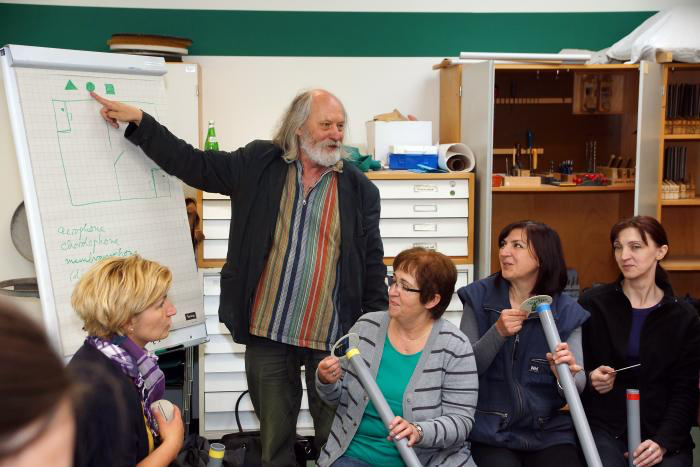 Den Kopf der Werkstatt bildet Peter Ausländer. Er ist seit 2009 Professor für Musik und Bewegung am Fachbereich Sozialwesen der Fachhochschule Bielefeld. Mindestens genauso wichtig ist, dass er seit fast 20 Jahren Instrumente baut. Ermüdende Routine scheint sich bei ihm nicht einzustellen. Im Gegenteil, jede Konstruktion wird von ihm getestet und optimiert. Damit die Windharfe klingt, ist selbstredend Wind von Nöten. Und so läuft er draußen hinter der Werkstatt auf und ab, auf der Suche nach einem Wind oder zumindest einer Böe, die die Mauerkordel in der Harfe zum Schwingen und Singen bringt. Der Testlauf wird dabei zugleich zu einer Demonstration für vorbeikommende Besucher.